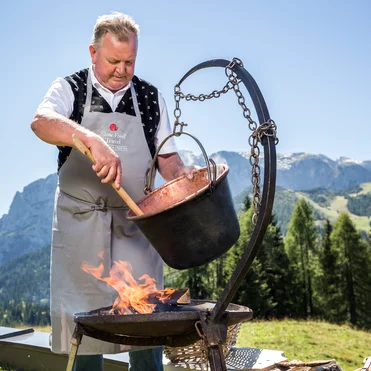 Auch heuer lehrt Hans Plattner bei Plattner’s Einkehr am Nassfeld nicht nur Holzknechten die richtige Zubereitung der „Original Kärntner Holzknecht-Frigga“.
