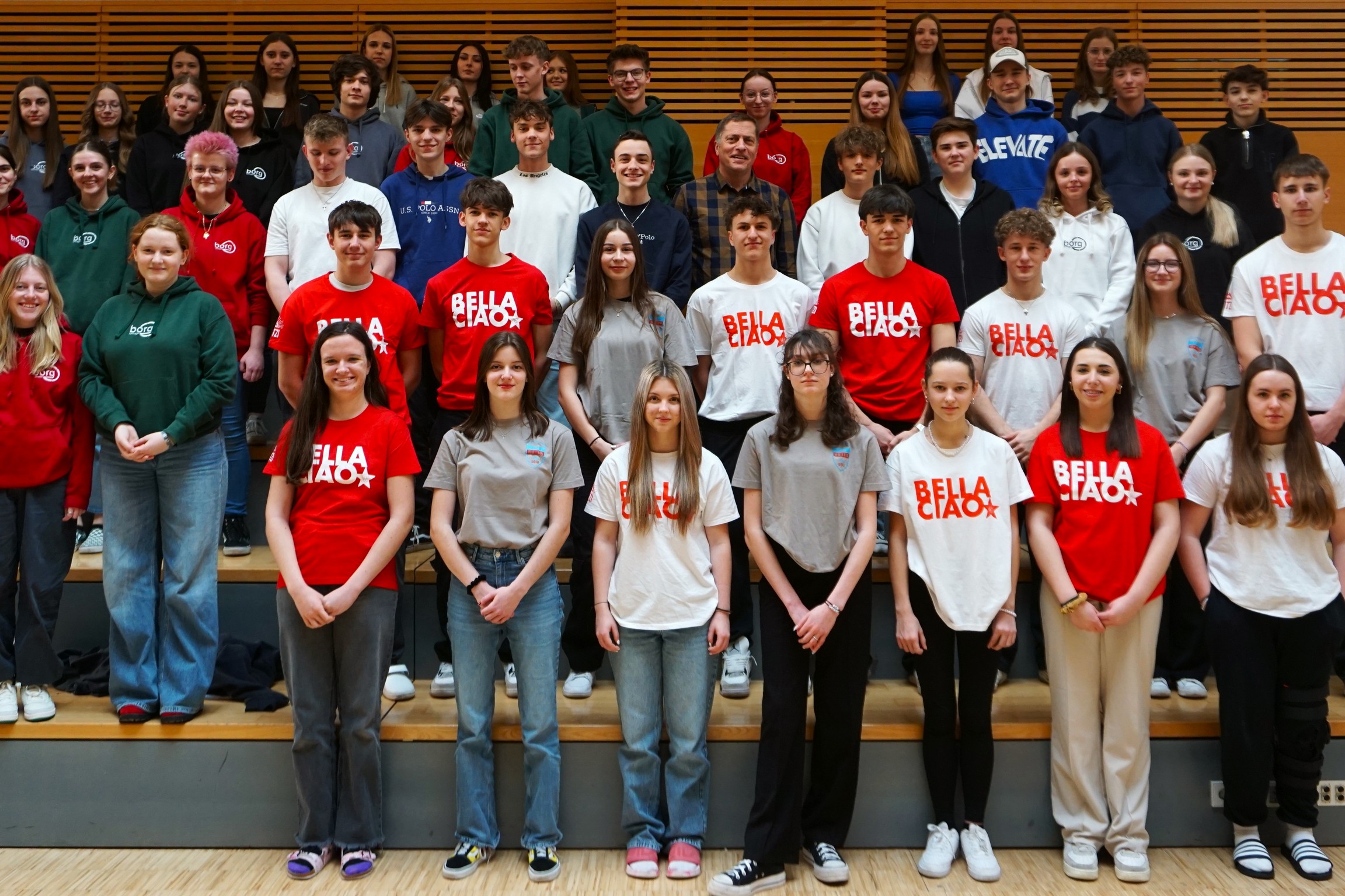Darin befanden sich für die Schüler je ein bedrucktes T-Shirt mit dem Titel der gemeinsam performten Lieder sowie Hauben und Pins.