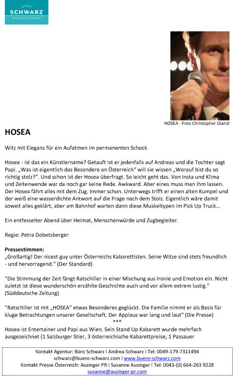 Hosea – ist das ein Künstlername? Getauft ist er jedenfalls auf Andreas und die Tochter sagt Papi. „Was ist eigentlich das Besondere an Österreich“ will sie wissen „Worauf bist du so richtig stolz?“. Und schon ist der Hosea überfragt. So leicht geht das.